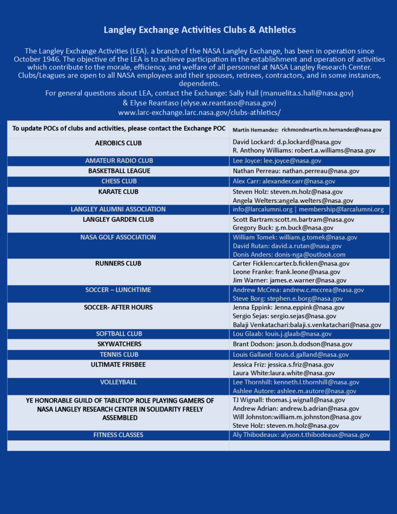 Clubs/Leagues are opened to all NASA employees and their spouses, retirees, LaRC contractors and in some instances, dependents.