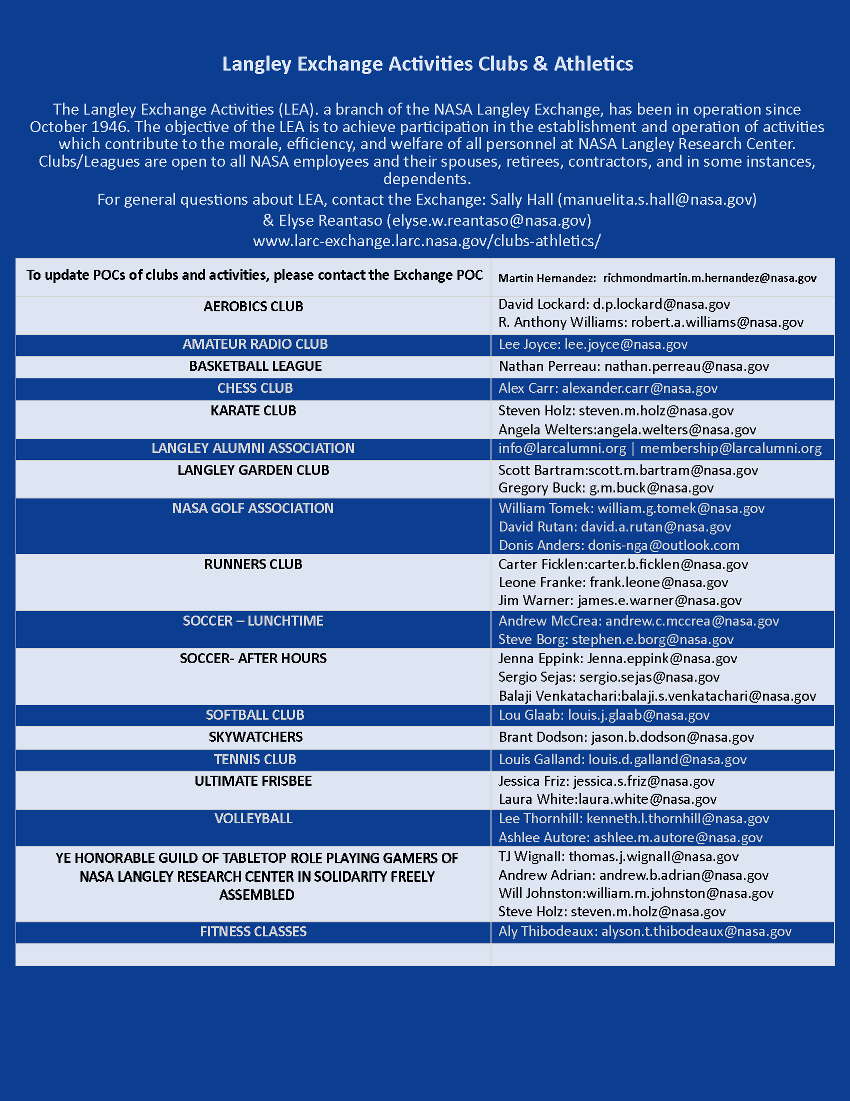 Clubs/Leagues are opened to all NASA employees and their spouses, retirees, LaRC contractors and in some instances, dependents.